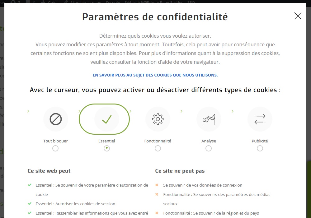 Le paramétrage peut être réalisé via l’encart vert en bas à droit lors de la connexion sur le site internet. L’utilisateur peut aussi paramétrer son navigation afin de s’assurer de la présence ou non de cookie et éventuellement, de les refuser de la plus simple des manières.